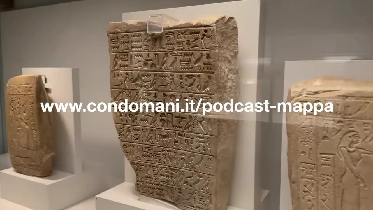Stele con geroglifici esposta in museo, con sovrapposizione testo del sito